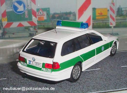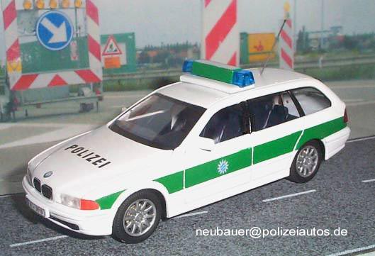 Modell wurde komplett umlackiert. Aufschrift "POLIZEI", sowie die Polizeisterne mit Landeswappen wurden angebracht. Das Modell wurde mit einer Hella RTK-6 Blaulichtanlage, sowie einer Funkantenne ausgerüstet. (Eigenbau: Neubauer)