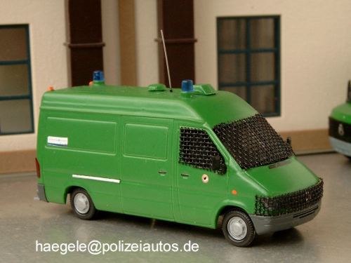 Kleintransporter (seriennah), Berlin 1:87 MB Sprinter Gefangenentransportwagen Grundmodell: (Artikel-Nr.: Herpa) Maßstab:0 Einsatzgebiet des Vorbilds: Gefangenentransportwagen Berlin8929 Aufrufe seit 14.10.2002 Neben der Lackierung wurden Scheiben und Kühlergrill vergittert sowie verschiedene Details ergänzt (Haegele). Zur Liste --- Serien- oder Sondermodelle --- Maßstab 1:43- Polizei Brandenburg 1:43- Bundespolizei (ehem. BGS ) 1:43- Polizei Hamburg 1:43- Polizei Niedersachsen 1:43- Polizei Nordrhein-Westfalen 1:43- Polizei Bayern 1:43- Polizei Berlin 1:43- Volkspolizei 1:43 Maßstab 1:87- Bundespolizei (1:87)- Feldjäger 1:87- Polizei Bremen 1:87- Polizei Hamburg 1:87- Bundesgrenzschutz (1:87)- Polizei Mecklenburg-Vorpommern 1:87...- Ordnungsamt (1:87)- Polizei Baden-Württemberg 1:87- Polizei Bayern 1:87- - Bereitschaftspolizei Bayern 1:87- - Kleintransporter (seriennah), Bayer...- - Pkw (seriennah), Bayern 1:87- Polizei Berlin 1:87- - Eigenbauten, Berlin 1:87- - Kleintransporter (seriennah), Berli...- - LKW (seriennah), Berlin 1:87- - PKW (seriennah), Berlin 1:87- Polizei Brandenburg 1:87- Polizei Hessen 1:87- Polizei Niedersachsen 1:87- Polizei Nordrhein-Westfalen 1:87- Erprobungsfahrzeuge 1:87- Polizei Rheinland-Pfalz 1:87- Polizei Saarland 1:87- Polizei Sachsen 1:87- Polizei Schleswig Holstein 1:87- Polizei Thüringen 1:87- Polizei Sachsen-Anhalt 1:87- Volkspolizei 1:87- Modelle im Einsatz (Dioramen) 1:87- Zoll 1:87 Maßstab 1:160 Sonstige Maßstäbe