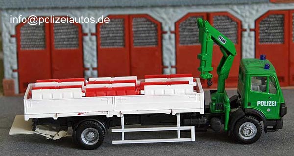 Die Basis für das Wechselladerfahrzeug bildet ein verlängertes Herpa-Fahrgestell. Die Absetzpritsche stammt ebenfalls von Herpa, der Ladekran und die Ladebordwand von Roco. Die Farbgebung erfolgte mit Airbrush-Technik, die Decals sind von Müller. (Michael Noack)