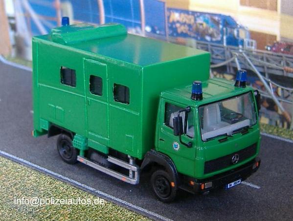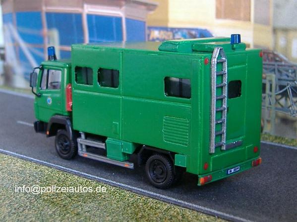 Beim Herpa-Grundmodell eines Lkw wurde zunächst das Fahrgestell gekürzt und das Führerhaus grün lackiert. Der Kastenaufbau wurde aus Plastikplatten selbst hergestellt. Die Details wurden mit Resten aus der Bastelkiste realisiert. Zum Schluss wurden Blaulichter und Polizeisterne, sowie die Kennzeichen angebracht. Umbau: Brückner.