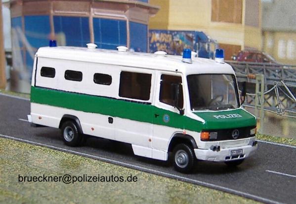 Bei einem Herpa Kastenwagen wurden zunächst die hinteren Türen und die seitliche Schiebetür verspachtelt. Die Sicken im Fensterbereich wurden geglättet und die seitlichen Fenster in die Karosserie gesägt. Nach dem Lackieren und Bemalen wurden aus dem Busch-Zubehör die Blaulichter, Dachluken und Starktonhörner angebracht. Zum Schluss wurden Landeswappen von DS-Decals, Polizei-Schriftzüge von TL-Decals und selbst gefertigte Kennzeichen angebracht. Umbau: Brückner