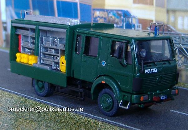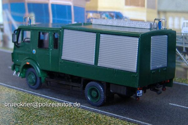 Als Grundmodell wurde ein Preiser Feuerwehrbausatz verwendet. An der Fahrerkabine wurden die hinteren Türen etwas nach vorne versetzt, die hinteren Seitenfenster ausgeschnitten und das Dach glattgespachtelt. Am Aufbau wurden die Rolläden gekürzt und aus Plastikplatten die Bordwände selbst gefertigt, außerdem wurde ebenfalls ein glattes Dach verbaut. Der Unterfahrschutz stammt aus dem Wiking-Zubehör, die Astabweiser über den Blaulichtern von Rietze, die Windabweiser vorne und die Abschleppstange von Roco. Umbau: Brückner