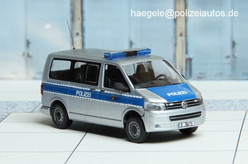 Das VW-Werbemodell von Wiking wurde mit (lackierten) blauen Flächen, Decals der Firma DS-Design und Rädern vom VW T4 der Firma herpa ausgestattet. Der farblich aufbereitete Signalbalken von Roco, vorbildgerechte Kennzeichen, eine Antenne, geschwärzte Rückspiegel und Frontblitzer aus Plastikstreifen runden den Umbau ab (Haegele).