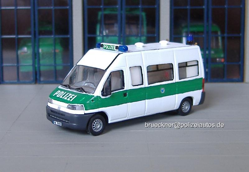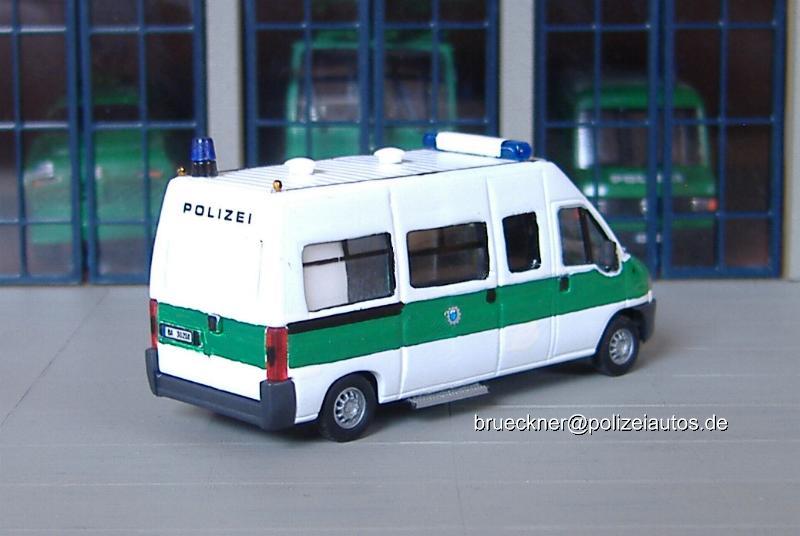 Aus zwei Transportern von Busch wurde eine lange Version zusammenebaut und mit seitlichen Fenstern versehen. Nach dem Lackieren wurde das Modell mit einem Eigenbau-Dachbalken, sowie Zusatzblinkern und Dachlüftern aus dem Busch-Zubehör ausgestattet. Die Beschriftung erfolgte mit Decals von TL und DS. Umbau: Brückner
