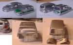 Nun werden die 4 einzelnen Karosserieteile aneinander angepasst und zusammengeklebt (Bild 6 und 7). An der Unterseite der Motorhaube muss einiges weggefeilt werden, damit hinterher die Windschutzscheibe vom alten Touran Platz hat, diese Arbeit bleibt aber unsichtbar.