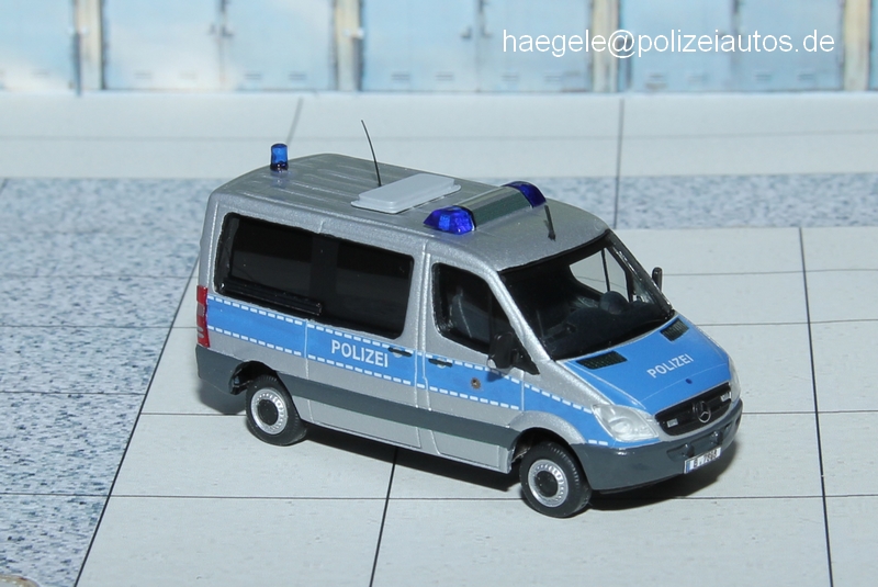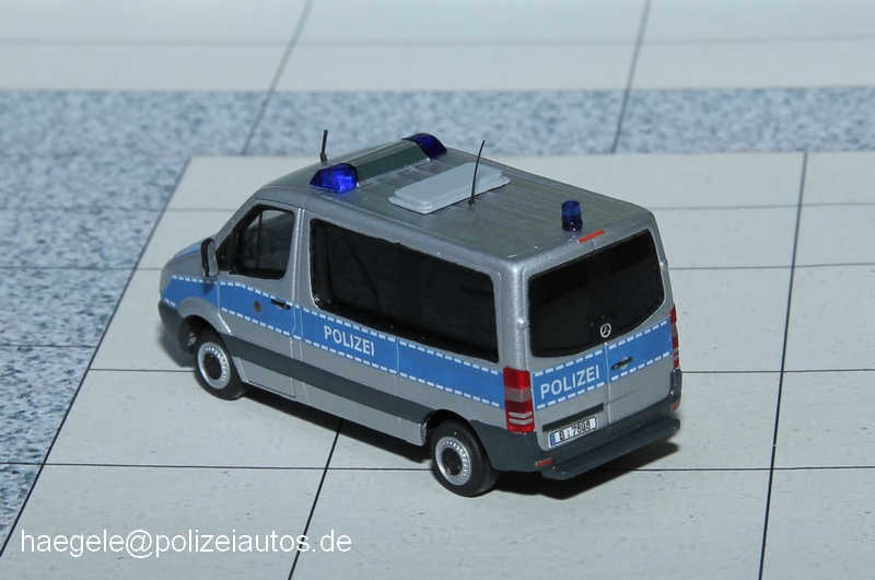 Es handelt sich hier um das erste Modell einer Kleinstserie vom MB Sprinter als kurze Busversion. Die Bausätze für diese Karosserieform, die bei den deutschen Polizeien häufig zu sehen ist, wurden nur innerhalb des Teams von Polizeiautos.de verteilt. Die Decals für die Berliner Variante wurden ebenfalls selbst entwickelt und über die Firma DS-Design gedruckt. Von DS-Design wurde auch das etwas modifizierte Heckblaulicht verwendet, der Blaulichtbalken und die Räder stammen aus dem Sortiment von Rietze (Haegele).