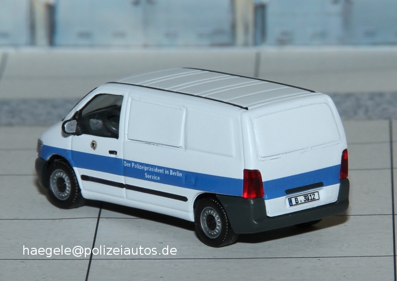 Kleintransporter (seriennah), Berlin 1:87 Mercedes-Benz Vito, Logistikfahrzeug Grundmodell: Herpa Maßstab:1:87 Einsatzgebiet des Vorbilds: Logistikfahrzeuge (neues Design) Berlin7367 Aufrufe seit 27.09.2014 Ein altes NEF von Herpa wurde mit Folienresten aus diversen Projekten zum Logistikfahrzeug umgebaut (Haegele). Zur Liste --- Serien- oder Sondermodelle --- Maßstab 1:43- Polizei Brandenburg 1:43- Bundespolizei (ehem. BGS ) 1:43- Polizei Hamburg 1:43- Polizei Niedersachsen 1:43- Polizei Nordrhein-Westfalen 1:43- Polizei Bayern 1:43- Polizei Berlin 1:43- Volkspolizei 1:43 Maßstab 1:87- Bundespolizei (1:87)- Feldjäger 1:87- Polizei Bremen 1:87- Polizei Hamburg 1:87- Bundesgrenzschutz (1:87)- Polizei Mecklenburg-Vorpommern 1:87...- Ordnungsamt (1:87)- Polizei Baden-Württemberg 1:87- Polizei Bayern 1:87- - Bereitschaftspolizei Bayern 1:87- - Kleintransporter (seriennah), Bayer...- - Pkw (seriennah), Bayern 1:87- Polizei Berlin 1:87- - Eigenbauten, Berlin 1:87- - Kleintransporter (seriennah), Berli...- - LKW (seriennah), Berlin 1:87- - PKW (seriennah), Berlin 1:87- Polizei Brandenburg 1:87- Polizei Hessen 1:87- Polizei Niedersachsen 1:87- Polizei Nordrhein-Westfalen 1:87- Erprobungsfahrzeuge 1:87- Polizei Rheinland-Pfalz 1:87- Polizei Saarland 1:87- Polizei Sachsen 1:87- Polizei Schleswig Holstein 1:87- Polizei Thüringen 1:87- Polizei Sachsen-Anhalt 1:87- Volkspolizei 1:87- Modelle im Einsatz (Dioramen) 1:87- Zoll 1:87 Maßstab 1:160 Sonstige Maßstäbe