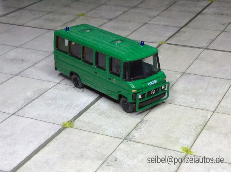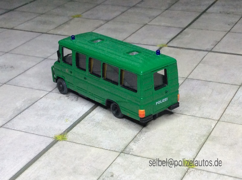 Kleintransporter (seriennah), Berlin 1:87 Mercedes-Benz 508D Grundmodell: Preiser Maßstab:1:87 Einsatzgebiet des Vorbilds: Gruppen- und Mannschaftskraftwagen Berlin4979 Aufrufe seit 01.05.2016 Das Preiser Modell wurde grün lackiert und mit einem Rammschutz ausgestattet. Desweiteren wurden zusammengebundene Vorhänge im Innenraum angedeutet. Umbau: Pascal Seibel Zur Liste --- Serien- oder Sondermodelle --- Maßstab 1:43- Polizei Brandenburg 1:43- Bundespolizei (ehem. BGS ) 1:43- Polizei Hamburg 1:43- Polizei Niedersachsen 1:43- Polizei Nordrhein-Westfalen 1:43- Polizei Bayern 1:43- Polizei Berlin 1:43- Volkspolizei 1:43 Maßstab 1:87- Bundespolizei (1:87)- Feldjäger 1:87- Polizei Bremen 1:87- Polizei Hamburg 1:87- Bundesgrenzschutz (1:87)- Polizei Mecklenburg-Vorpommern 1:87...- Ordnungsamt (1:87)- Polizei Baden-Württemberg 1:87- Polizei Bayern 1:87- - Bereitschaftspolizei Bayern 1:87- - Kleintransporter (seriennah), Bayer...- - Pkw (seriennah), Bayern 1:87- Polizei Berlin 1:87- - Eigenbauten, Berlin 1:87- - Kleintransporter (seriennah), Berli...- - LKW (seriennah), Berlin 1:87- - PKW (seriennah), Berlin 1:87- Polizei Brandenburg 1:87- Polizei Hessen 1:87- Polizei Niedersachsen 1:87- Polizei Nordrhein-Westfalen 1:87- Erprobungsfahrzeuge 1:87- Polizei Rheinland-Pfalz 1:87- Polizei Saarland 1:87- Polizei Sachsen 1:87- Polizei Schleswig Holstein 1:87- Polizei Thüringen 1:87- Polizei Sachsen-Anhalt 1:87- Volkspolizei 1:87- Modelle im Einsatz (Dioramen) 1:87- Zoll 1:87 Maßstab 1:160 Sonstige Maßstäbe