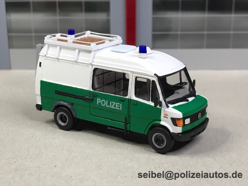 Der geschlossene Transporter von Herpa wurde seitlich mit Fenstern versehen und vorbildlich lackiert. Desweiteren wurde eine aufwendige Dachplattform aus Profilen gebaut und eine Heckwarnmarkierung dargestellt. Details wie die Klappleiter am Heck, Inneneinrichtung und eine Dachluke runden den Umbau ab.