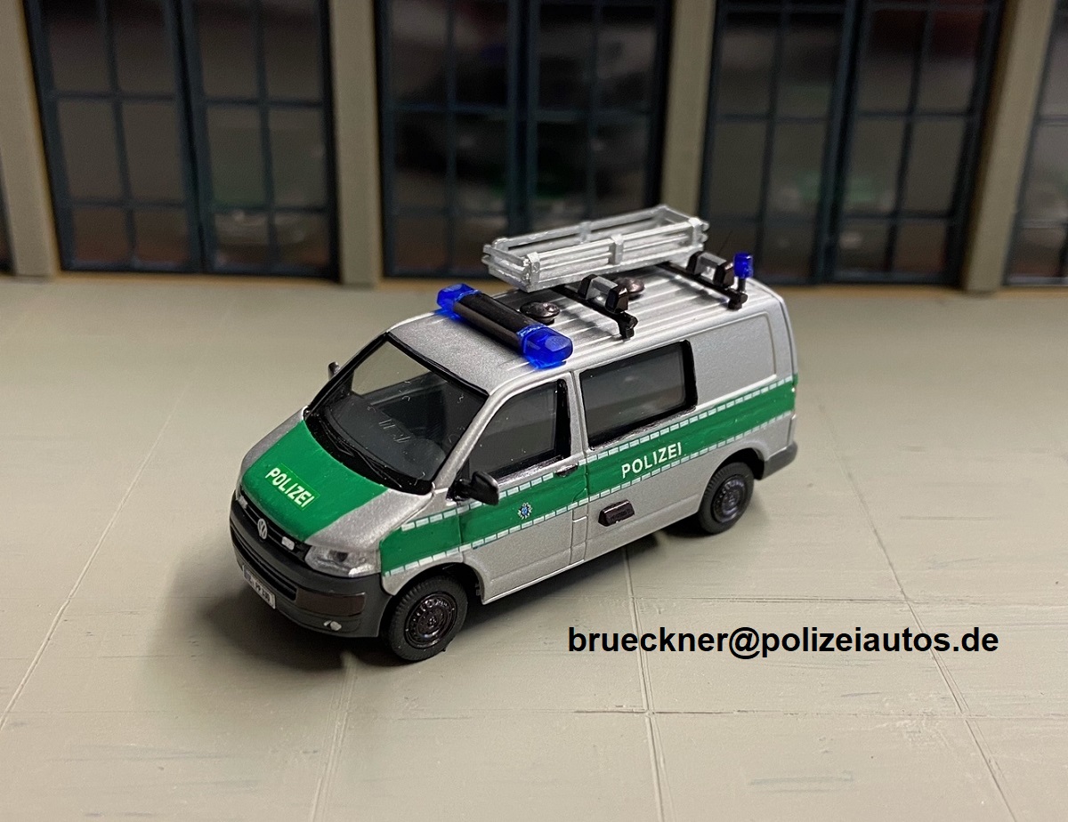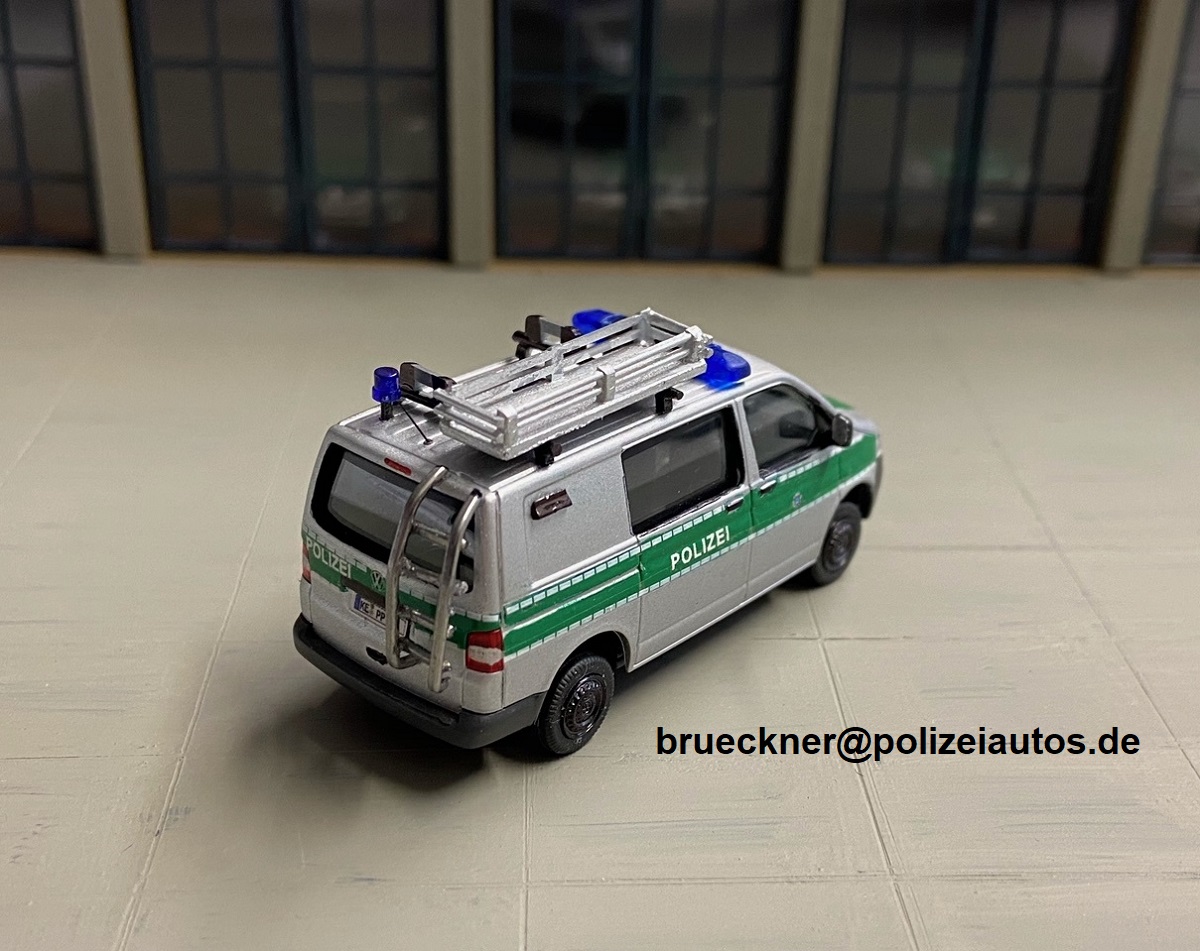 Als Grundmodell diente ein Rietze T5-Kastenwagen. zunächst wurden die seitlichen Fenster herausgeschnitten, das Modell silber lackiert, mit der grünen Bauchbinde bemalt und mit Decals aus meiner Sammlung beschriftet. Das Fahrwerk wurde höhergelegt und sämtliche Anbauten, wie Dachträger, Skihalter, Transportkiste, Leiter, Lüfter, Blaulichtbalken und Frontblitzer mit Plastikteilen aus der Bastelkiste selbst gefertigt. Umbau: Brückner