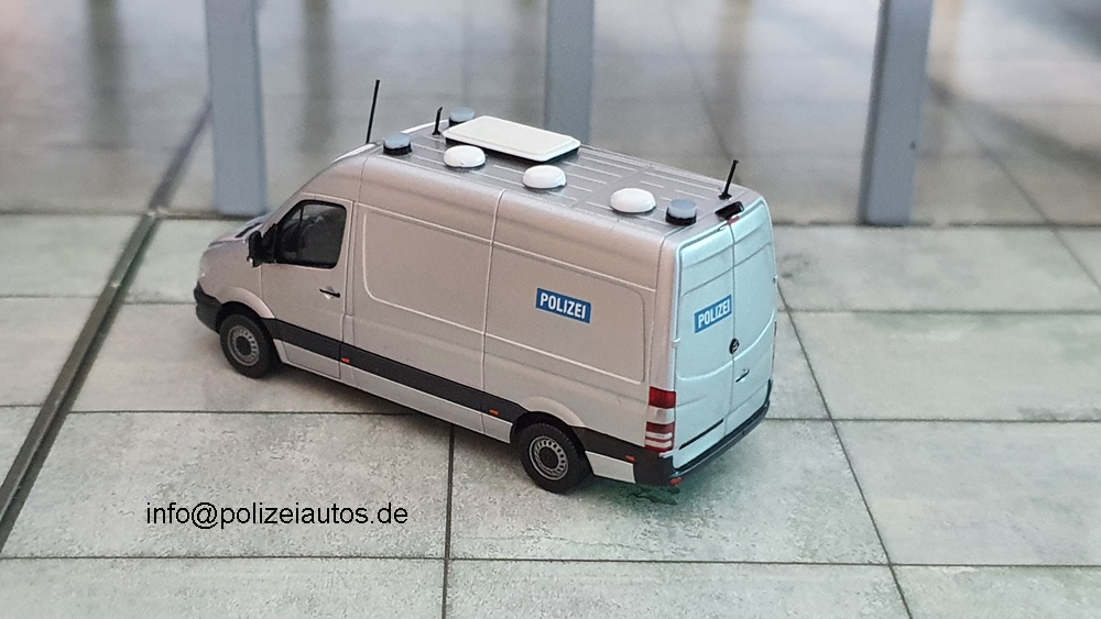 Das Grundmodell eines Kastenwagens von Herpa wurde in silber lackiert. Nach dem Trocknen konnten die Decals von SRM87 aufgebracht werden. Abschließend wurden Details hervorgehoben und die Blaulichter (DS-DESIGN) sowie die Dachlüfter, Klimaanlage (Eigenbau), Trittstufe und Antennen ergänzt.