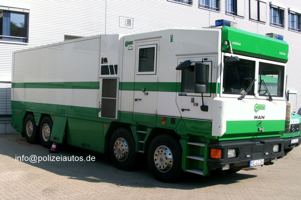 4-achsiges Sonderfahrzeug für Geld- und Werttransporte mit zwei Blau/Klar-farbenen Sondersignalanlagen.