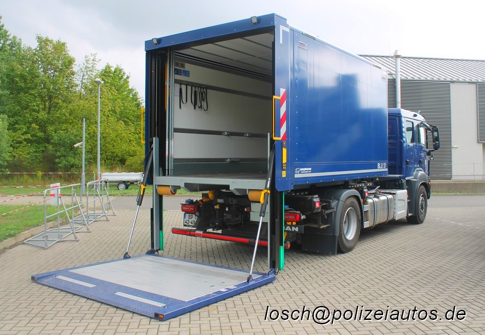 Bei diesem von der Firma Empl ausgebauten Fahrzeug handelt es sich um das 2021 in Dienst gestellte Musterfahrzeug dieser neuen Fahrzeuggeneration. Gegenüber den Vorgängermodellen Mercedes 1017 mit fest montiertem Gerätekoffer verfügen diese neuen Fahrzeuge über jeweils 2 austauschbare Ladungsträger (ATL), die mittels Rollwagen unterschiedlich beladen werden können, abhängig vom Einsatzanlass bzw. den Aufgaben der jeweiligen technischen Einsatzeinheit. Zur Verfügung steht ein geschlossener Kofferaufbau mit heckseitigem Vertikallift sowie ein Kofferaufbau mit seitlichen Gerätefächern und heckseitigem Vertikallift. Zudem verfügt das Fahrzeug über eine Seilwinde, Rotzler Treibmatic (Zugkraft vorne 10t, Zugkraft hinten 20t). Weiterhin besitzt dieses Fahrzeug (wie nur einige Modelle der späteren Serie) eine ADR-Zulassung für den Transport gefährlicher Güter (z.B. Kraftstoffkanister). |