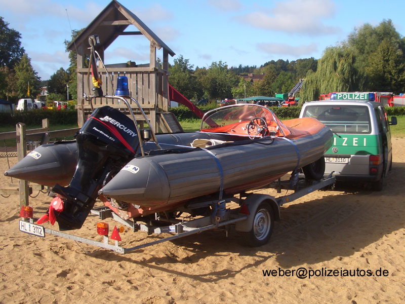 | Beschreibung: | Gespann der Wasserschutzpolizei Schleswig-Holstein. Funkstreifenwagen VW T4 mit Trailer und darauf verladenem Avon SR 4 RIB-Boot mit Mercury-Außenborder. |