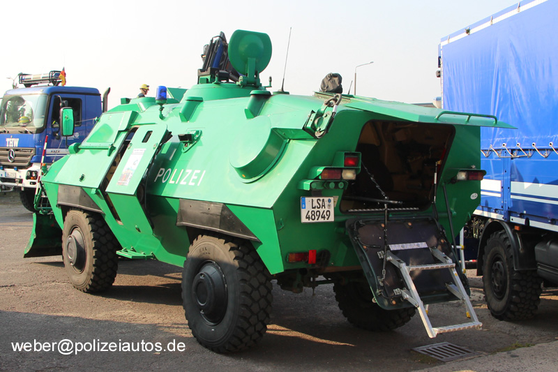 | Beschreibung: | Sonderwagen SW 4 der Bereitschaftspolizei Sachsen-Anhalt, mit Räumschild samt Peilstangen und einseitig hochgeklappter Scheibenpanzerung. |