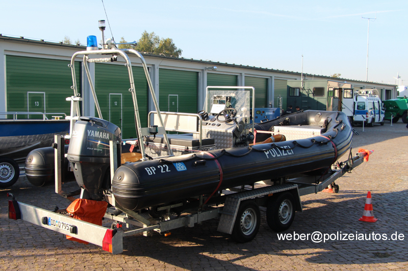 | Beschreibung: | Bundeseinheitliches Mehrzweckboot (MZB) -BP 22- der Leipziger Bereitschaftspolizei auf einem Trailer. Technische Daten Mehrzweckboot (MZB) mit Festrumpf und Schlauchwulst Länge: 6,50m Breite: 2,50m Tiefgang: 0,40m 4-Takt Benzin Yamaha Außenbordmotor Leistung: 100 PS |