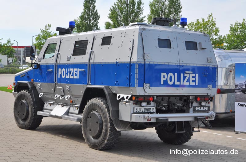 | Beschreibung: | Auf der GPEC 2016 war der Survivor R in der Polizeiausführung ausgestellt. Entwickelt wurde das Fahrzeug gemeinsam von Rheinmetall MAN und Achleitner. Technische Daten Zul. Gesamtgewicht: 15000 kg Leergewicht: 10900 kg Motor: MAN 6,9 Liter, Sechszylinder Leistung: 330 PS / 242 kW Treibstoff: Diesel / Kerosin max. Geschwindigkeit: 100 km/h (abgeriegelt) Fotos: Gottung u.a. |