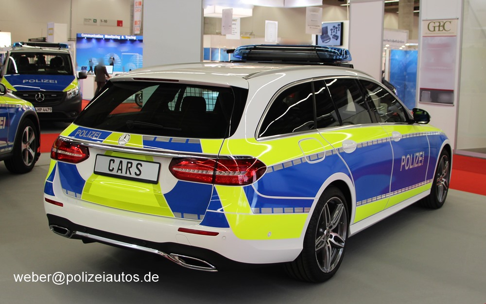 Mercedes-Benz-E-Klasse-T-Modell in der Version als Funkstreifenwagen, ausgestellt auf der GPEC 2018.