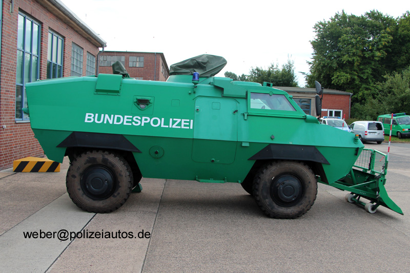| Beschreibung: | Sonderwagen SW 4 der Bundespolizei mit Räumschild samt Peilstangen und hochgeklappter Scheibenpanzerung. Das gleiche Fahrzeug mit alter Beschriftung und BG-Kennzeichen ist HIER zu sehen. |