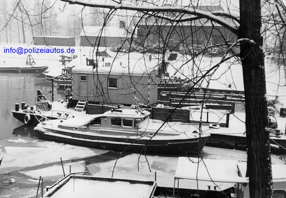 Streifenboot 20 der Wasserschutzpolizei Niedersachsen, hier um 1980 im Bauhafen Thune / Mittellandkanal.