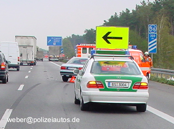 | Beschreibung: | Sperrung des rechten Hauptfahrstreifens und schnelle Absicherung einer Unfallstelle auf der BAB 2 durch die weithin sichtbare Warntafel auf dem Fahrzeugdach eines Funkstreifenwagens (MB E-Klasse) der Autobahnpolizei. |
