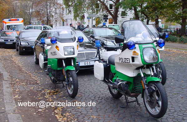 | Beschreibung: | Am 01.November 2004 weilte der Herr Bundespräsident, Horst Köhler, zu seinem Antrittsbesuch in der Stadt Braunschweig. Zu seiner Eskorte, Streckenschutz u.a., gesellten sich folgende, abgebildete, Dienstfahrzeuge; Kräder: BMW K 75, BMW R 80 RT, sowie Pkw VW Phaeton und Mercedes-Benz S-Klasse. Die 2. Ansicht zeigt u.a. das Fahrzeug des Bundespräsidenten (Kennzeichen: 0-1) mit Standarte des Bundespräsidenten. |