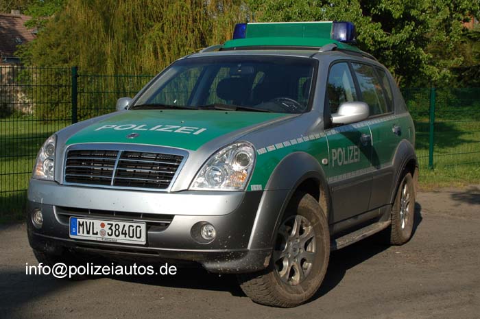 Der Ende 2007 gelieferte Geländewagen Ssangyong Rexton wurde durch die Zentralwekstätten IuK und Kfz zu einem silber-grünen Polizeifahrzeug umgebaut. Das Fahrzeug mit 2,7 l CDI Motor und 163 PS ist mit einer zulässigen Anhängelast von 3,5 t bestens für den Einsatz als Zugmittel für Bootstrailer auch in schwierigem Gelände geeignet. Quelle: LPBK MV, Gerd Krause. Fotos: Gottung |