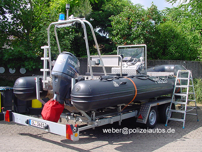 | Beschreibung: | Bundeseinheitliches Mehrzweckboot (MZB) -Nr. 32- der Oldenburger Bereitschaftspolizei auf einem Trailer. Technische Daten MZB mit Festrumpf und Schlauchwulst Hersteller: Deutsche Schlauchboote (DSB) Länge: 6,50m Breite: 2,50m Tiefgang: 0,40m 4-Takt Benzin Yamaha Außenbordmotor Leistung: 100 PS Höchstgeschwindigkeit: ca.35 kn / 60 Km/h |