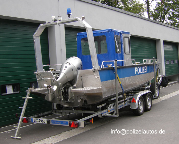 Motorboot der Bereitschaftspolizei auf einem Transportanhänger. - Fotos: Thorsten Schiffer