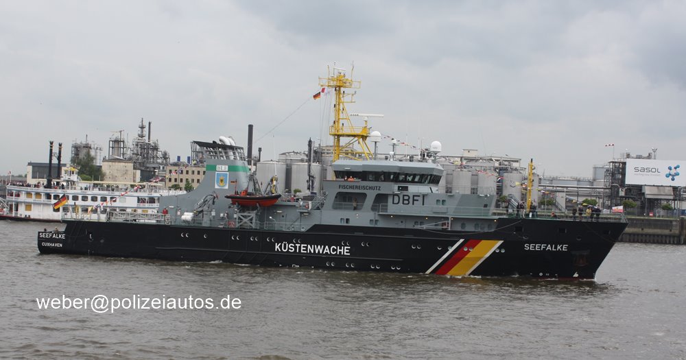 | Beschreibung: | Fischereischutzschiff Seefalke im Hamburger Hafen. Technische Daten Werft: Peene-Werft GmbH in Wolgast Baujahr: 2008 Eigner: Bundesministerium für Landwirtschaft und Ernährung (BLE) Baunummer: 559 Länge: 72,80 m Breite: 12,50 m Seitenhöhe: 6,80 m Konstruktionstiefgang: 5,00 m Antrieb: Semi-dieselelektrisch. Beide Verstellpropeller werden angetrieben über zwei Hauptmotoren des Typs MTU 20V4000 M73L und Getriebe. Die Antriebsleistung kann durch die beiden E-Fahrmotoren (twin booster operation) erhöht werden. Bei Betrieb beider Antriebssysteme wird eine Geschwindigkeit von ca. 19,7 kn erreicht. Möglich ist ein Antrieb auch nur über die E-Fahrmotoren. |