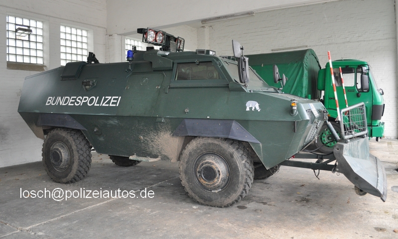 Sonderwagen SW 4 der Bundespolizei mit Lichtaufsatz, Räumschild samt Peilstangen und hochgeklappter Scheibenpanzerung.