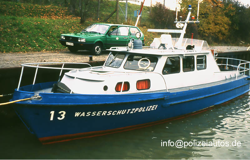 | Beschreibung: | Polizeistreifenboot 13 der Wasserschutzpolizei Niedersachsen. Technische Daten: Baujahr: 1968 Bauwerft: Schürenstedt Bardenfleth Länge: 12,15 m Breite: 3,13 m Tiefgang: 1,15 m Verdrängung: 9,8 t Maschinenleistung: 1 x 180 PS Höchstgeschwindigkeit: 25 km/h Bootskörper/Aufbauten: Stahl Einsatzgebiet: Jade Einsatzzeit: 1968 – ca. 1987 WSPK-Wilhelmshaven und ca. 1987 - 2000 als sog. Tauschboot im Bereich Niedersachsen. Bei Bedarf wurde es auf den Kanälen und Flüssen eingesetzt. Im Jahr 2000 a.D. HIER ist der Nachfolger. Im Hintergrund ist das Land(Streifen-)fahrzeug zu sehen, ein VW Passat (B2) Variant. Foto aus 1990 in Braunschweig |