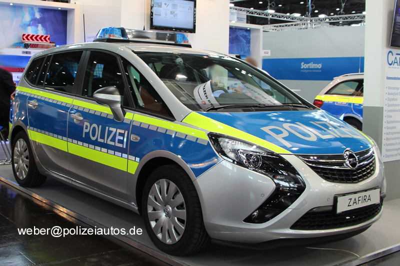 Opel Zafira Tourer mit silberner Grundfarbe, in der Version als Funkstreifenwagen, ausgestellt auf der GPEC 2014.