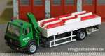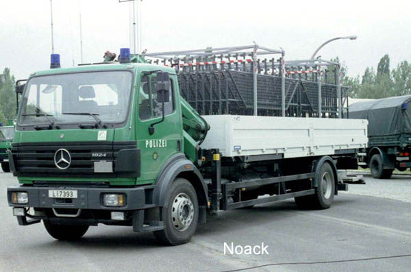| Beschreibung: | LKW mit Wechelpritsche und Ladekran zum Transport von Absperrgittern (pro LKW 2 Container mit je 15 Gittern), hier ohne Plane. Der Aufbau des Fahrzeuges erfolgte bei "Erhardt Karosseriebau" in Dresden, die Ladebordwand ist von Bär, der Ladekran von MKG. Solche Fahrzeuge sind auch bei einigen Polizeidirektionen im Einsatz. - Foto: www.modellmicha.de |