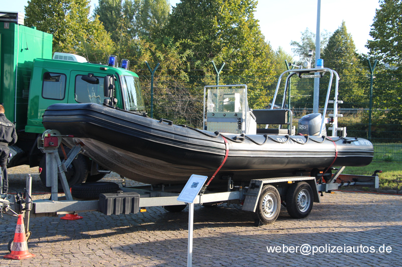 | Beschreibung: | Bundeseinheitliches Mehrzweckboot (MZB) -BP 22- der Leipziger Bereitschaftspolizei auf einem Trailer. Technische Daten Mehrzweckboot (MZB) mit Festrumpf und Schlauchwulst Länge: 6,50m Breite: 2,50m Tiefgang: 0,40m 4-Takt Benzin Yamaha Außenbordmotor Leistung: 100 PS |